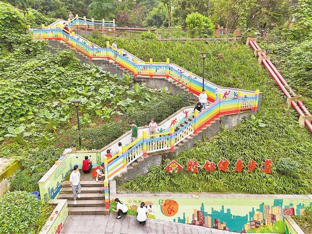 6月12日,南岸区城南家园八组团,志愿者们和居民一起绘画彩色步道。