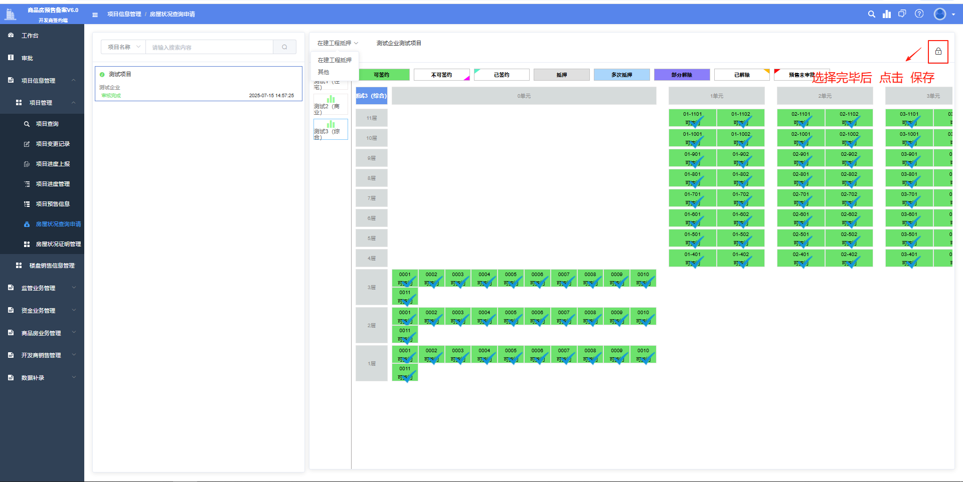 1.登录房地产开发企业客户端,选择业务类型、需要查询的楼幢。