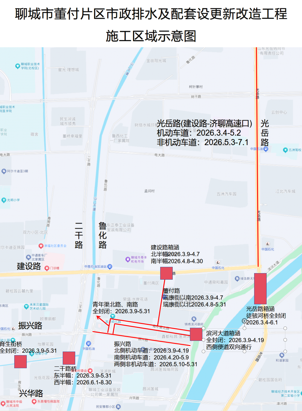 聊城市董付片区市政排水及配套设施更新改造工程为我市2026年重大民生项目之一,按照我市振兴路、董付路、青年渠整体提升改造计划,需对振兴路(鲁化路-徒骇河)、董付路(青年渠-建设路)、青年渠(振兴路-徒骇河)、青年渠育生街桥、青年渠二干渠桥分段实施占道施工。根据《中华人民共和国道路交通安全法》等法律法规规定,现通告如下: